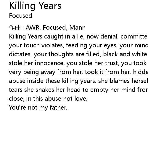 | Killing Years caught in a lie, now denial, committed crimes, her life to steal, your touch violates, feeding your eyes, your mind, filth in your life, it dictates. your thoughts are filled, black and white images pages drilled, you stole her innocence, you stole her trust, you took her very being, you stole her very being away from her. took it from her. hidden past, these cries of fear, abuse inside these killing years. she blames herself, trying to escape. in your tears she shakes her head to empty her mind from her past, follows much to close, in this abuse not love. | |