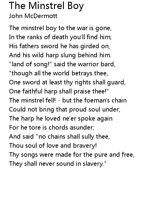 The minstrel boy to the war is gone, |