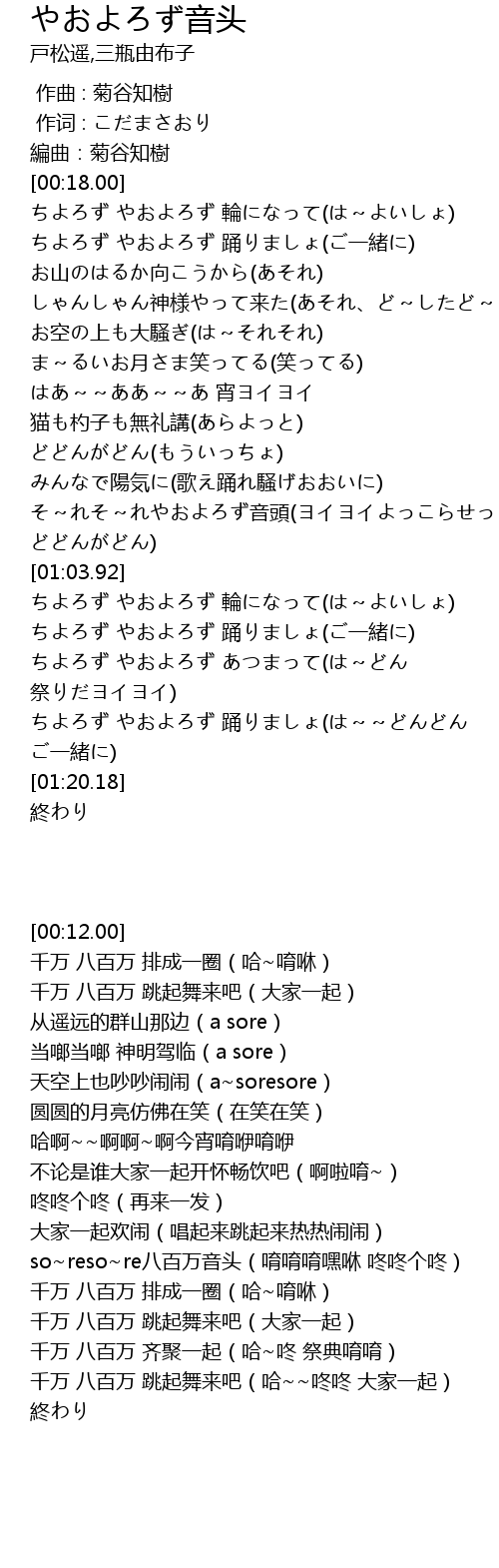 | [00:18.31] | ちよろず やおよろず 輪になって(は~よいしょ) |