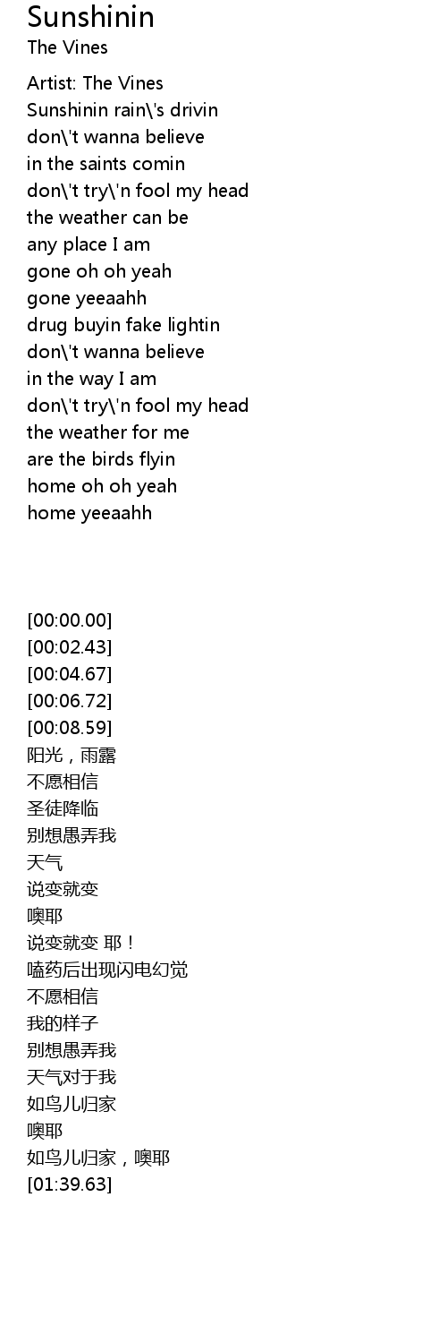 | [00:14.68] | Sunshinin rain\'s drivin |