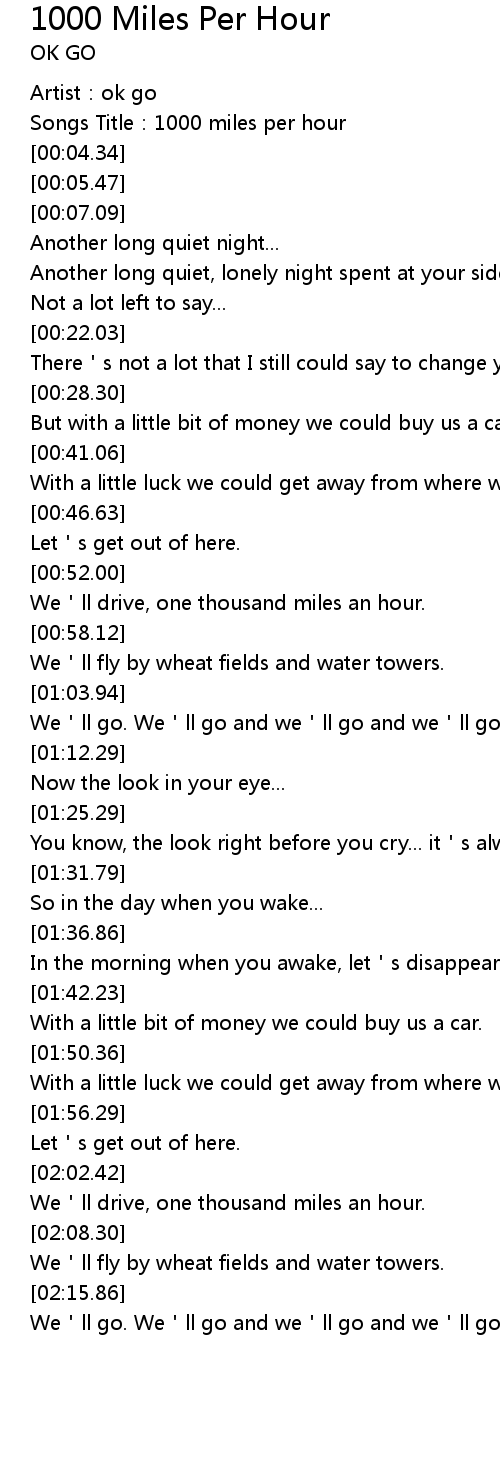 | [00:02.66] | Songs Title: 1000 miles per hour |