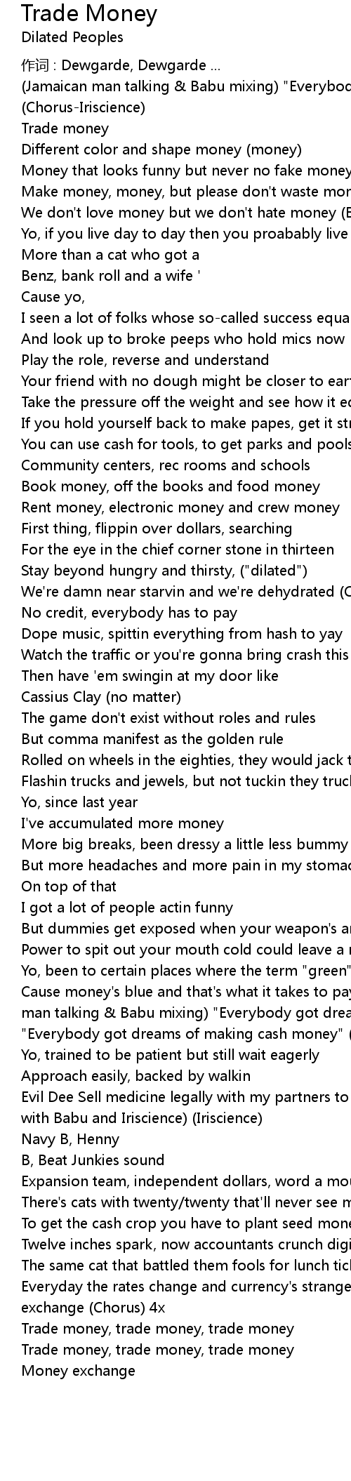 | Cause money's blue and that's what it takes to pay rent (Chorus) 2x (Jamaican man talking & Babu mixing) "Everybody got dreams of making cash money" "Everybody got dreams of making cash money" (Evidence) | |