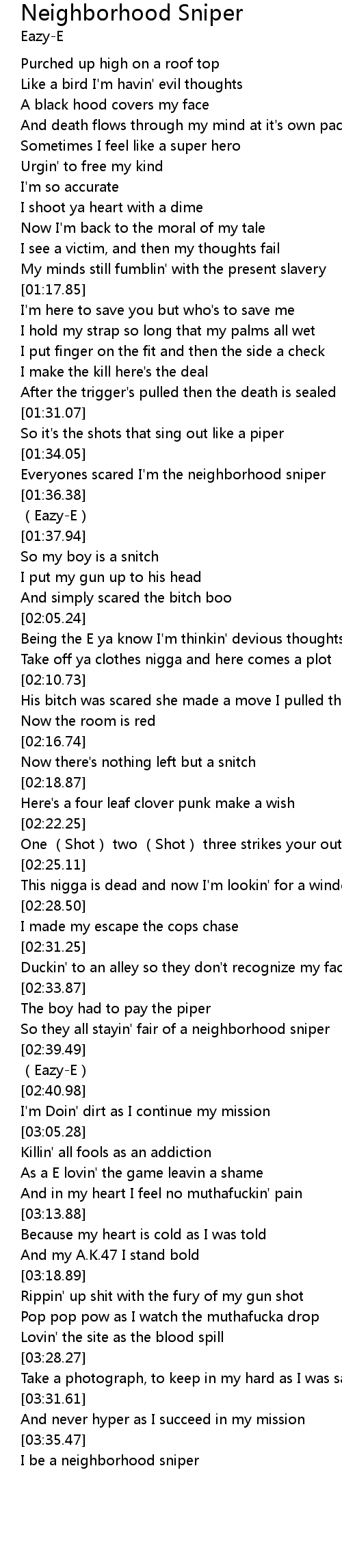 | [01:34.57] | Everyones scared I' m the neighborhood sniper |