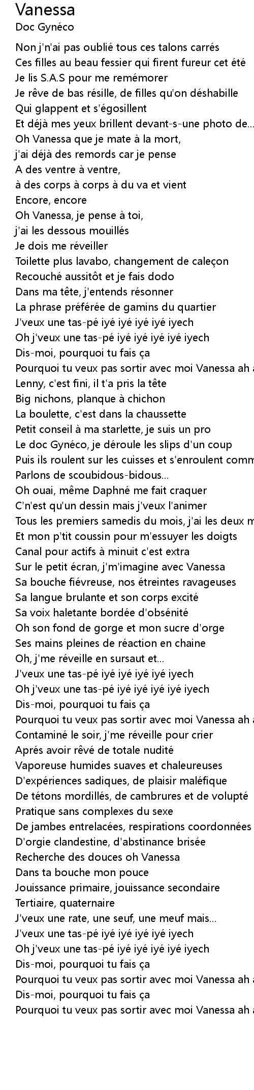| [01:28.000] | Pourquoi tu veux pas sortir avec moi Vanessa ah ah ah |