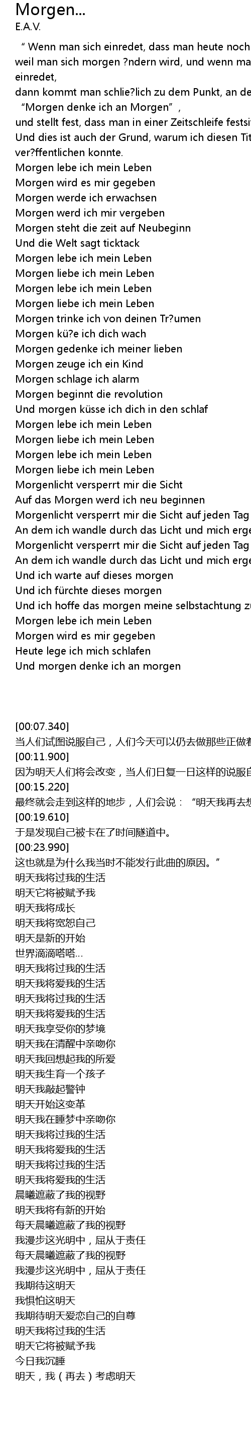 | [00:15.220] | dann kommt man schlie? lich zu dem Punkt, an dem man sagen wird: " Morgen denke ich an Morgen", |