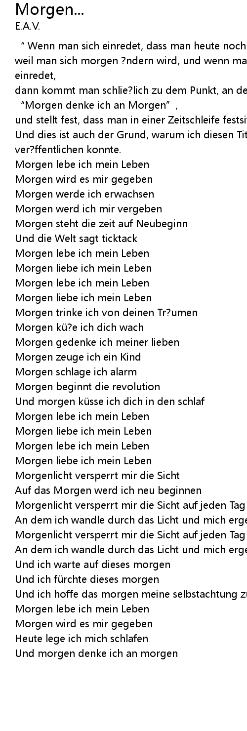 | [00:15.220] | dann kommt man schlie? lich zu dem Punkt, an dem man sagen wird: " Morgen denke ich an Morgen", |