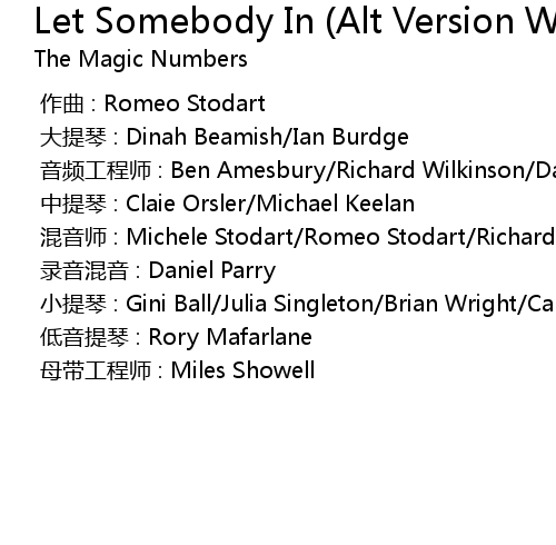 | Song | Let Somebody In (Alt Version With Strings By Robert Kirby) |