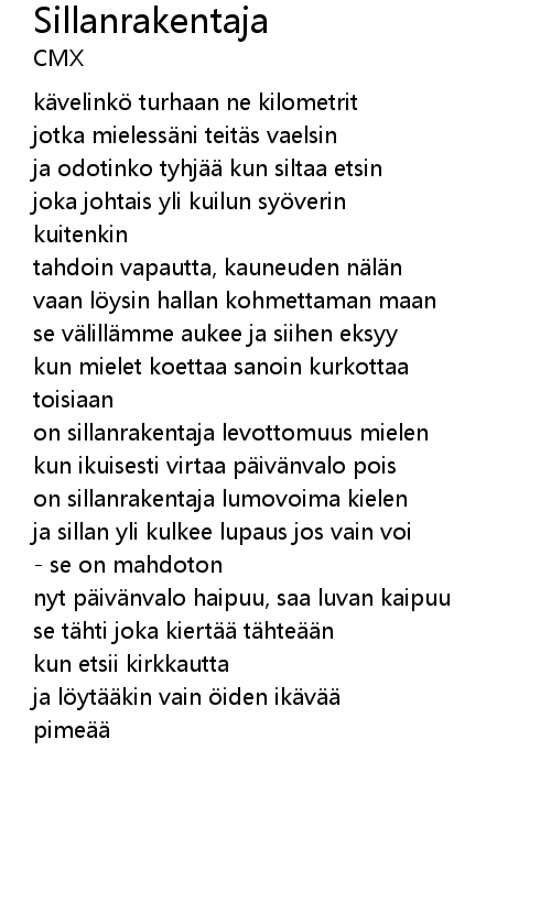 | ja odotinko tyhjää kun siltaa etsin | |