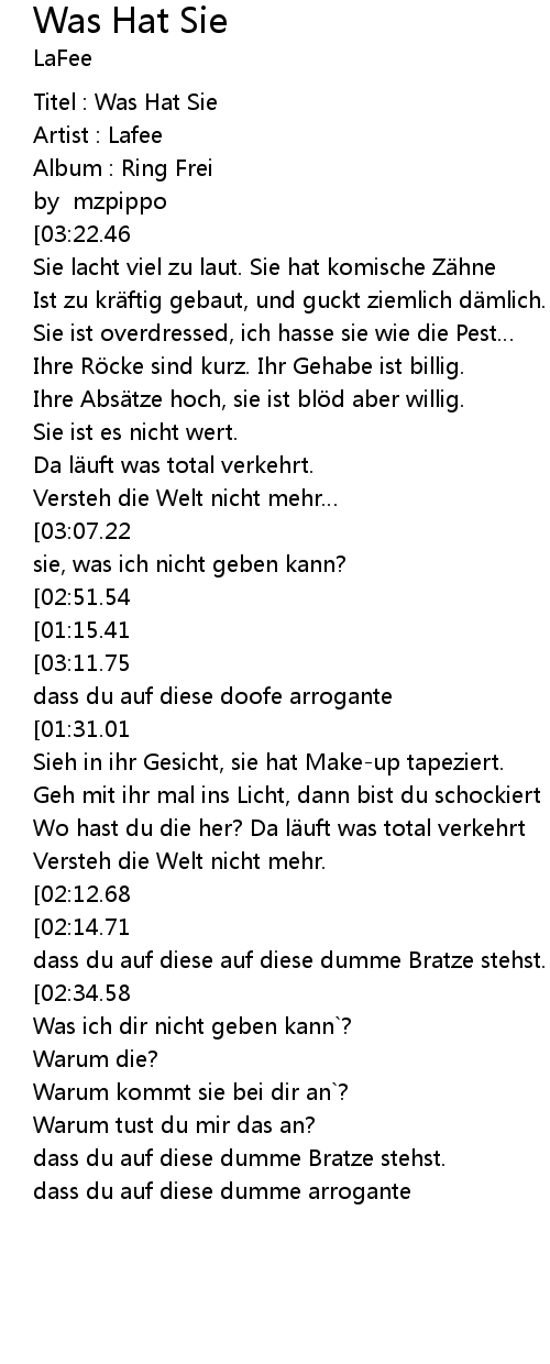| [00:50.67] | Ihre Absätze hoch, sie ist blöd aber willig. |
