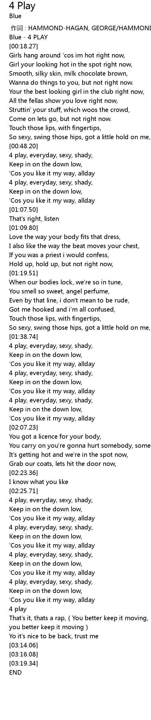 | [00:58.28] | 4 play, everyday, sexy, shady, |