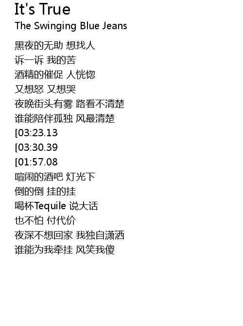 | [03:37.69][03:23.13][01:41.57] | It' s true qing yi ku wo yi bu zai hu |