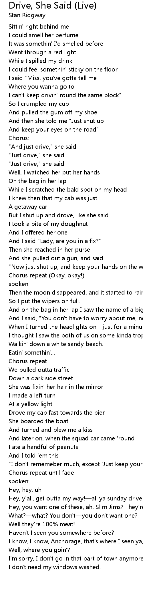 | "I don't rememeber much, except 'Just keep your hands on the wheel'" | |