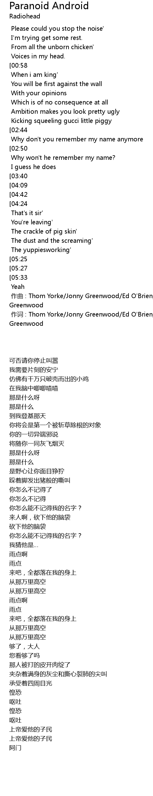 | [00:00.00] | 作词 : Thom Yorke/Jonny Greenwood/Ed O'Brien/Phil Selway/Colin Greenwood |