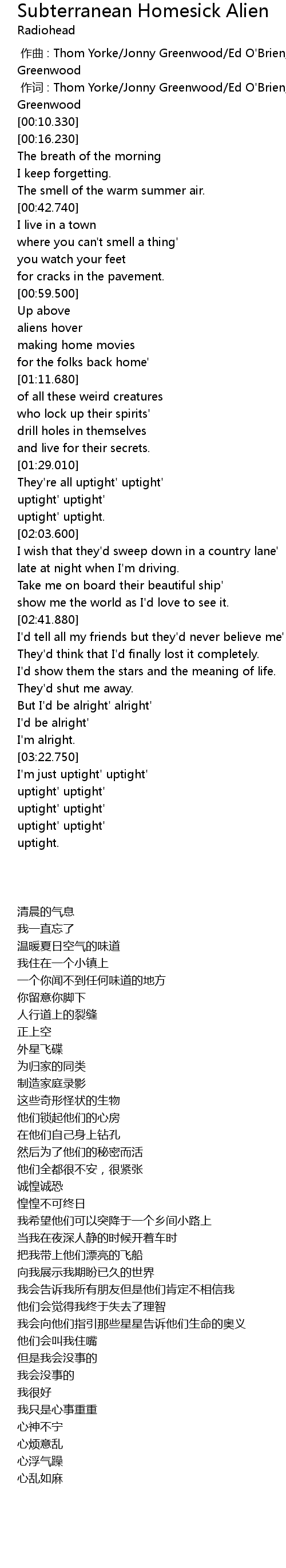 | [00:01.00] | 作词 : Thom Yorke/Jonny Greenwood/Ed O'Brien/Phil Selway/Colin Greenwood |