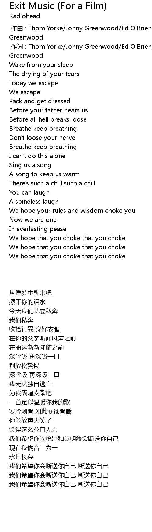 | [00:01.00] | 作词 : Thom Yorke/Jonny Greenwood/Ed O'Brien/Phil Selway/Colin Greenwood |