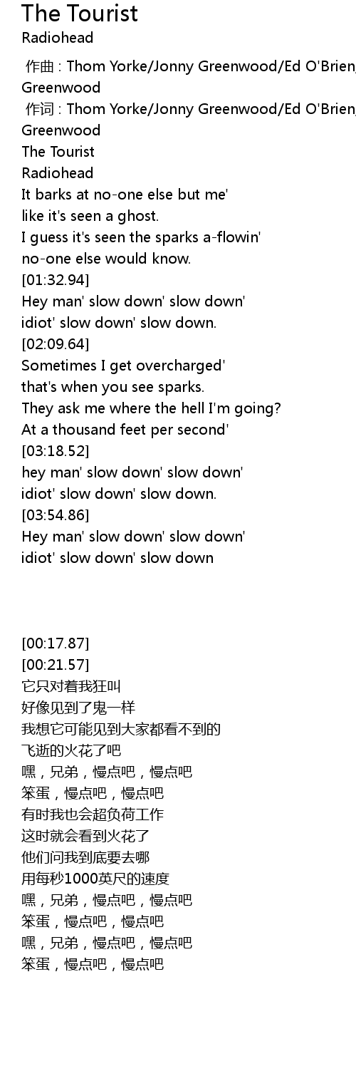 | [00:01.00] | 作词 : Thom Yorke/Jonny Greenwood/Ed O'Brien/Phil Selway/Colin Greenwood |