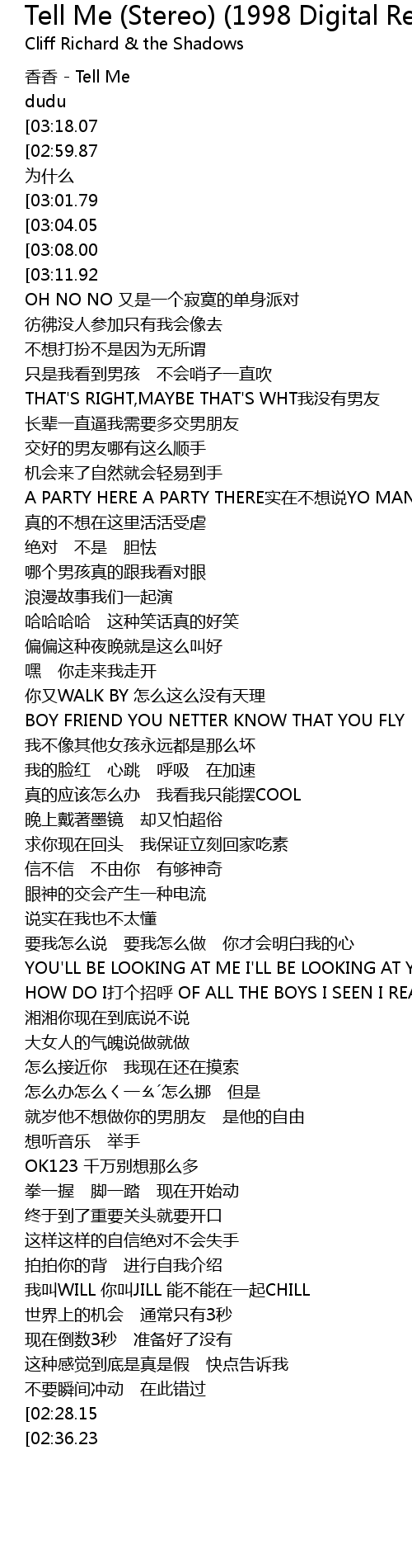 | [03:32.22][02:59.87][02:43.19][01:39.45][00:51.78][00:03.43] | JUST TELL ME wei shi me |