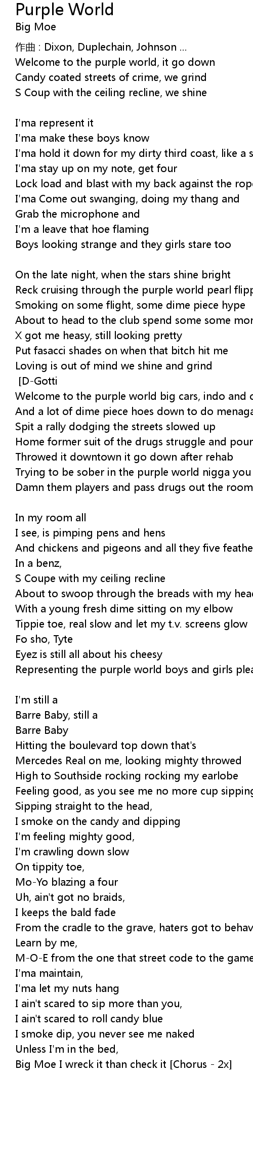 | Representing the purple world boys and girls please believe me Chorus 2x Big Moe | |