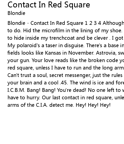 Blondie - Contact In Red Square 1 2 3 4 Although I'm young I got a job to do. Hid the microfilm in the lining of my shoe. Call it a trip. business Got to hide inside my trenchcoat and be clever . I got my papers and a cyanide pill. My polaroid's a taser in disguise. There's a base in the hills, and the wheat fields looks like Kansas in November. Astrovia, sweet comrade, your nation is your gun. Your love reads like the broken code you sent me. One last contact in red square, unless I have to run and the long arms of the K.G.B. detect me. Can't trust a soul, secret messenger, just the rules that lie like circuits in your brain and a cool .45. The wind is ice and foreign air tastes strange. I.C.B.M. Bang! Bang! You're dead! No one left to worry. Kiss me quick, now I have to hurry. Our last contact in red square, unless I have to run and the long arms of the C.I.A. detect me. Hey! Hey! Hey! |