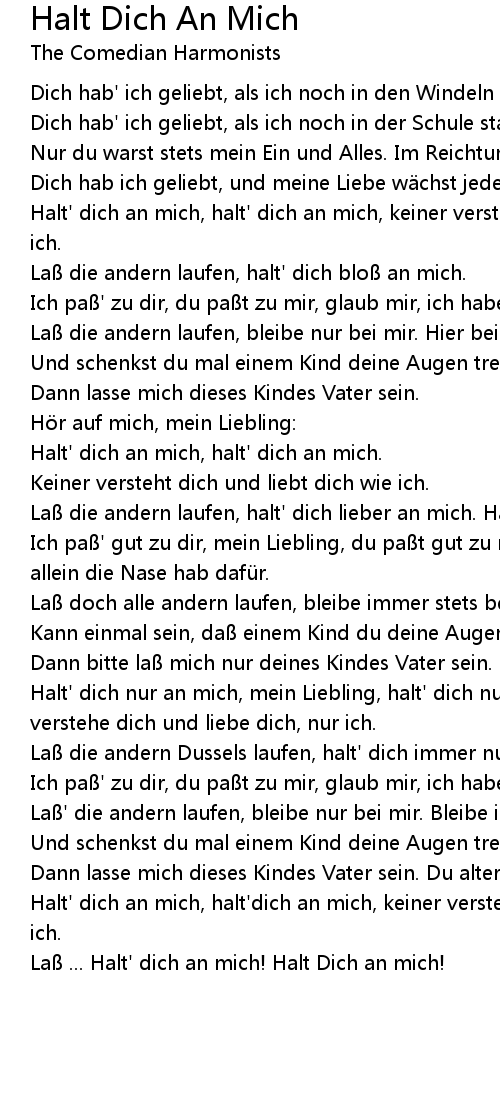 | Laß die andern laufen, halt' dich lieber an mich. Halt' dich an mich. | |