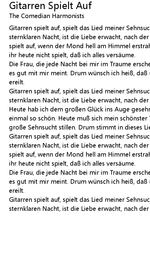 | Gitarren spielt auf, spielt das Lied meiner Sehnsucht für mich. In der sternklaren Nacht, ist die Liebe erwacht, nach der Frau meiner Träume. Gitarren spielt auf, wenn der Mond hell am Himmel erstrahlt, denn ich habe gefühlt, wenn ihr heute nicht spielt, daß ich alles versäume. | |