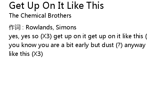 | yes, yes so (X3) get up on it get up on it like this (X4) get up on it like this you know you are a bit early but dust (?) anyway yes, yes so (X2) get up on it like this (X3) |