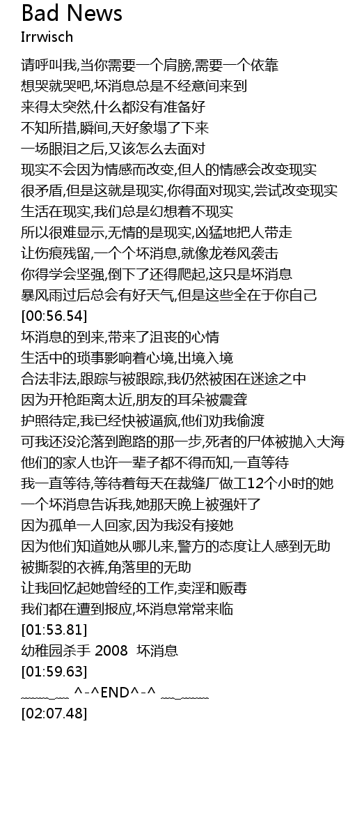 | [01:55.51] | 幼稚园杀手 2008 坏消息 |