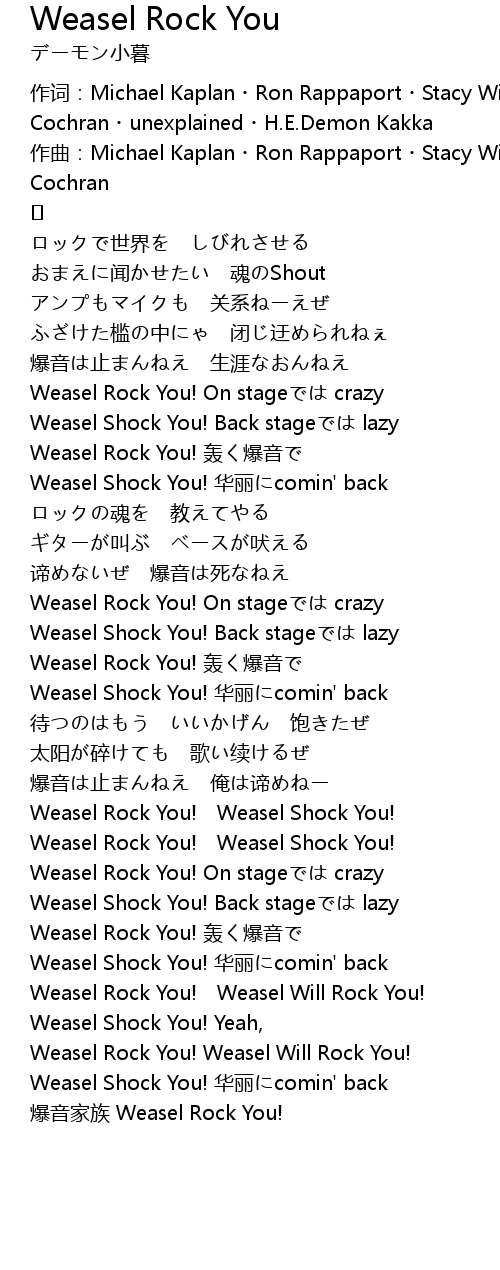 | 作词:Michael Kaplan・Ron Rappaport・Stacy Wilde・David Wilde・Karl Cochran・unexplained・H.E.Demon Kakka | |