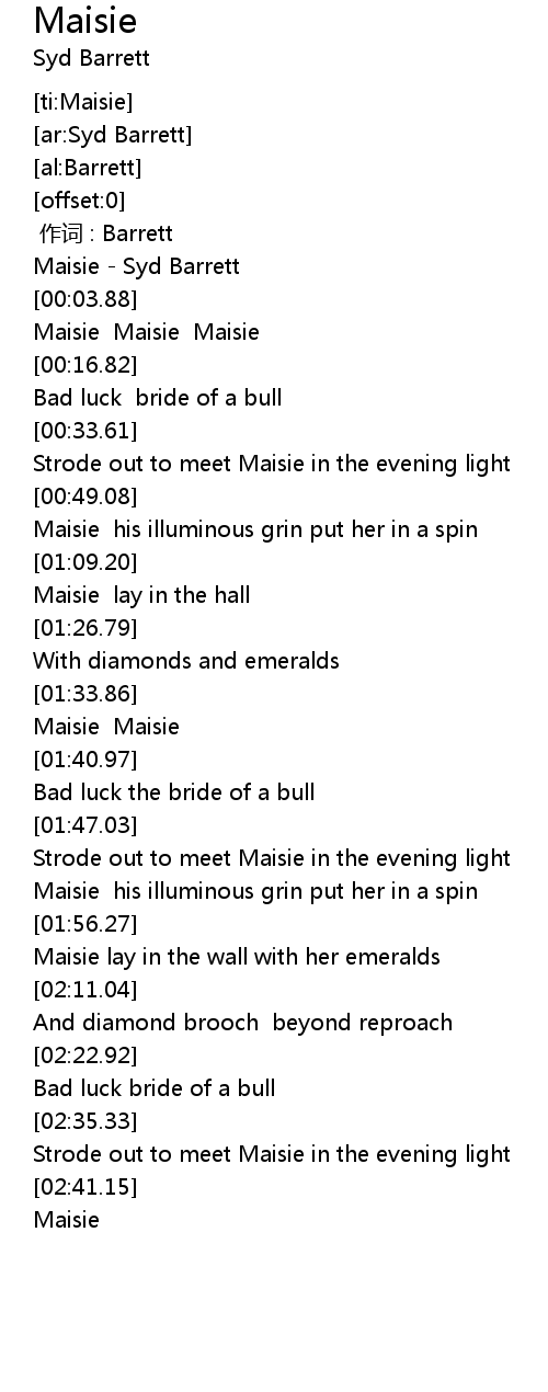 | [02:00.76] | Maisie lay in the wall with her emeralds |