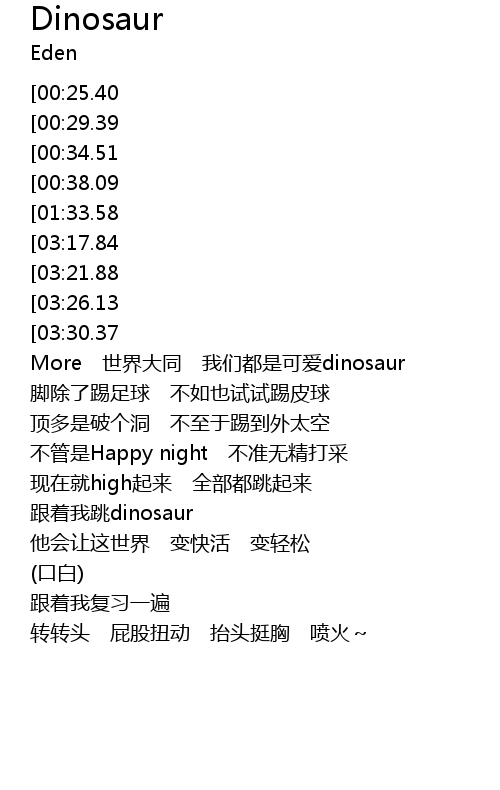 | [03:08.62][01:33.58][00:42.19] | 跟着我dinosaur 一起来dinosaur |
