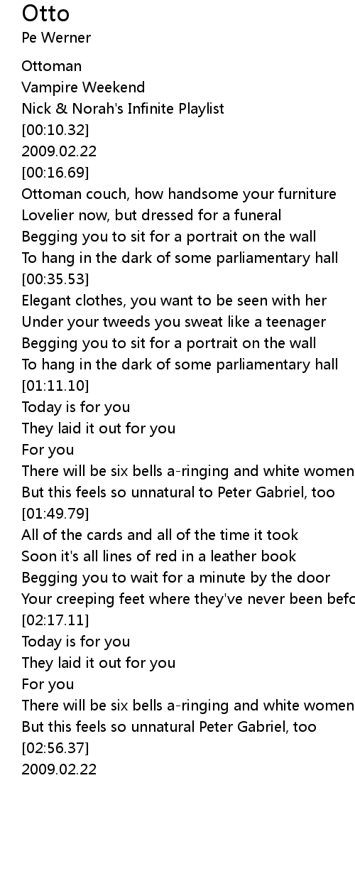 | [00:18.12] | Ottoman couch, how handsome your furniture |