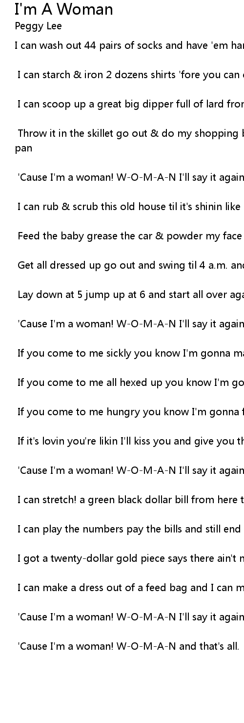 'Cause I'm a woman! W-O-M-A-N I'll say it again |