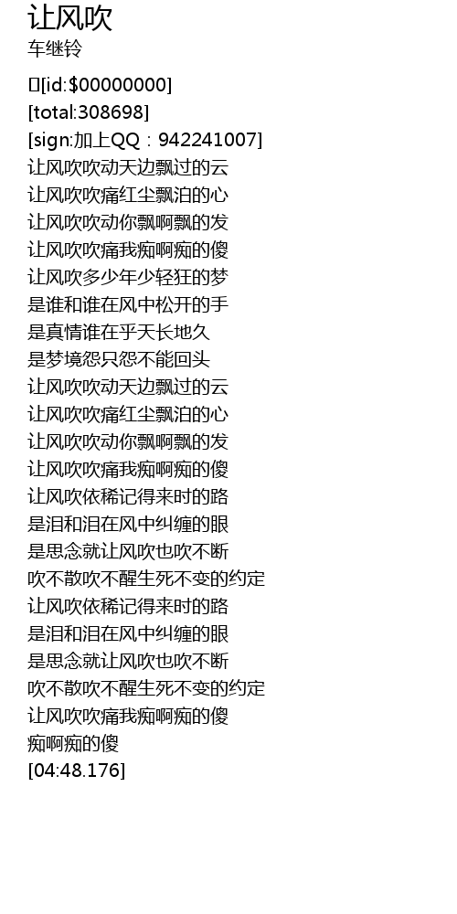 | [04:33.227] | rang feng chui chui tong wo chi a chi de sha |