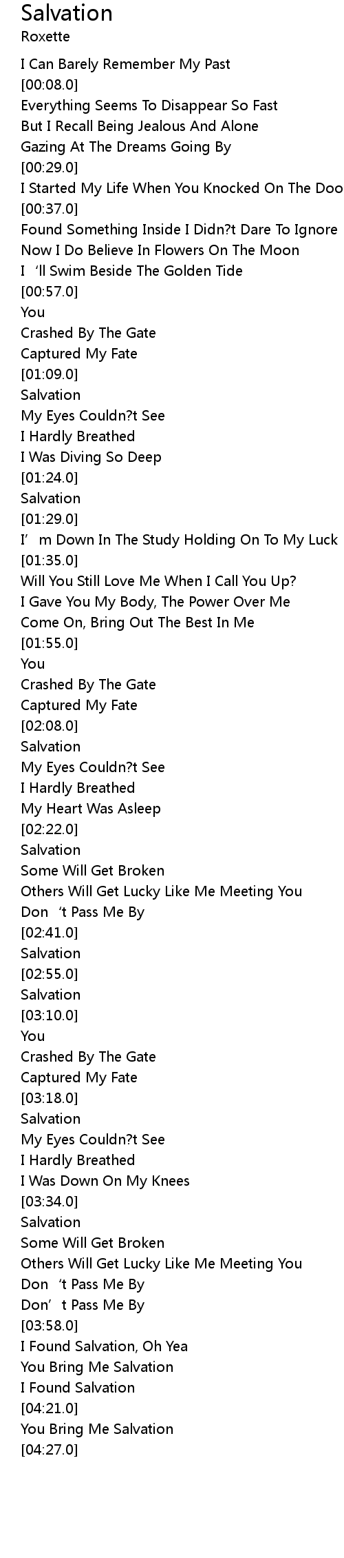| [04:02.0] | I Found Salvation, Oh Yea |