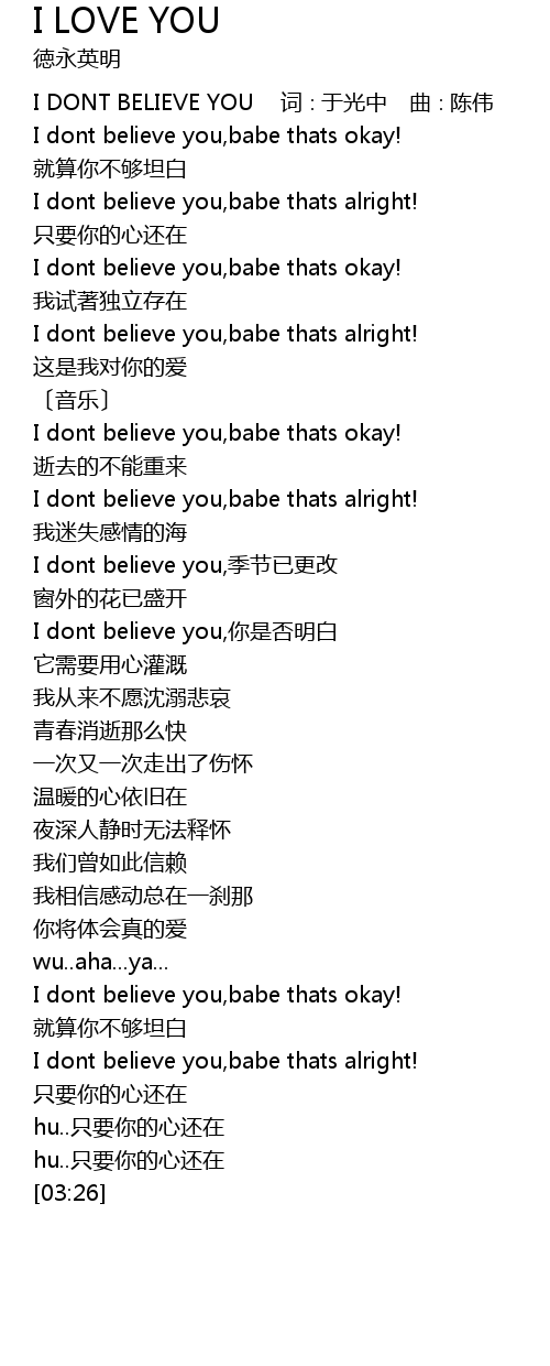 | [00:00] | I DONT BELIEVE YOU 词∶于光中 曲∶陈伟 |