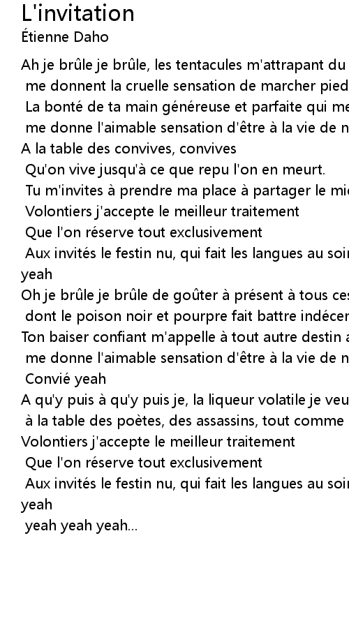 | Aux invité s le festin nu, qui fait les langues au soir se dé lier, se dé lier yeah | |