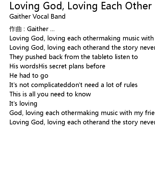 | Song | Loving God, Loving Each Other |