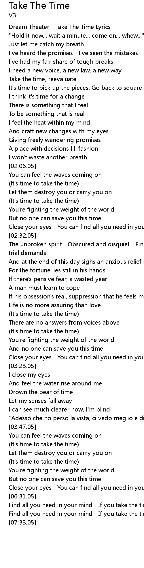 | [00:00.05] | Dream Theater - Take The Time Lyrics |