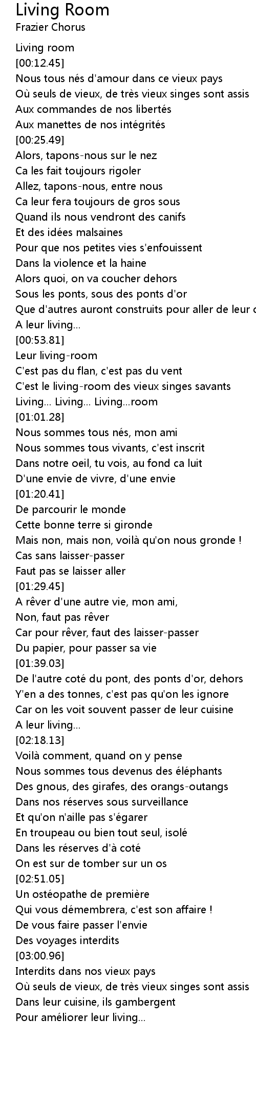 | [00:57.05] | C' est le livingroom des vieux singes savants |