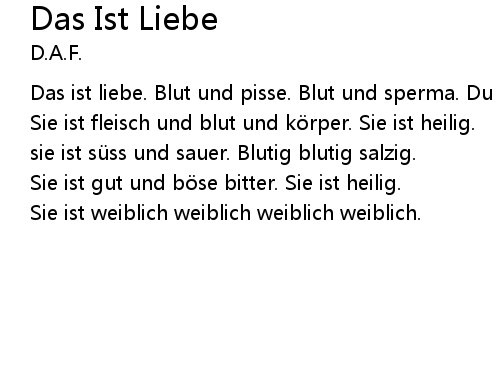| Das ist liebe. Blut und pisse. Blut und sperma. Du und ich. | |