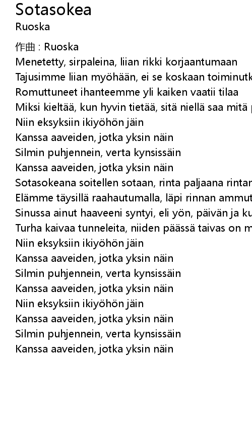 | Sotasokeana soitellen sotaan, rinta paljaana rintaman usvaan | |