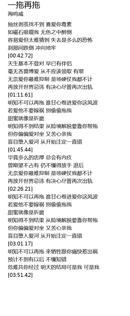 | [02:41.15] | 明知得不到结果 从险境解脱要靠你帮拖 |