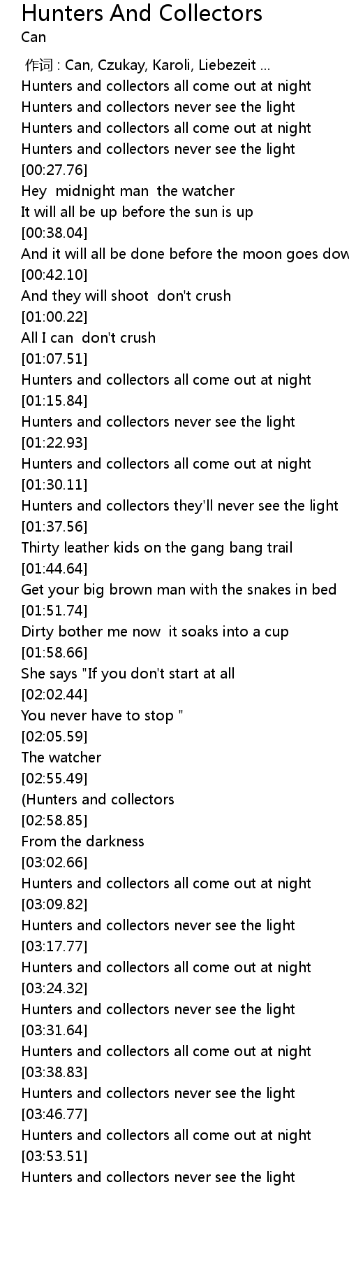 | [01:11.01] | Hunters and collectors all come out at night |
