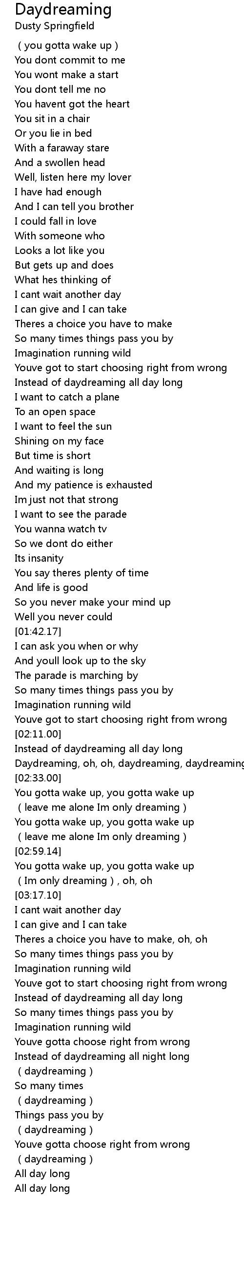 | [02:17.42] | Daydreaming, oh, oh, daydreaming, daydreaming |