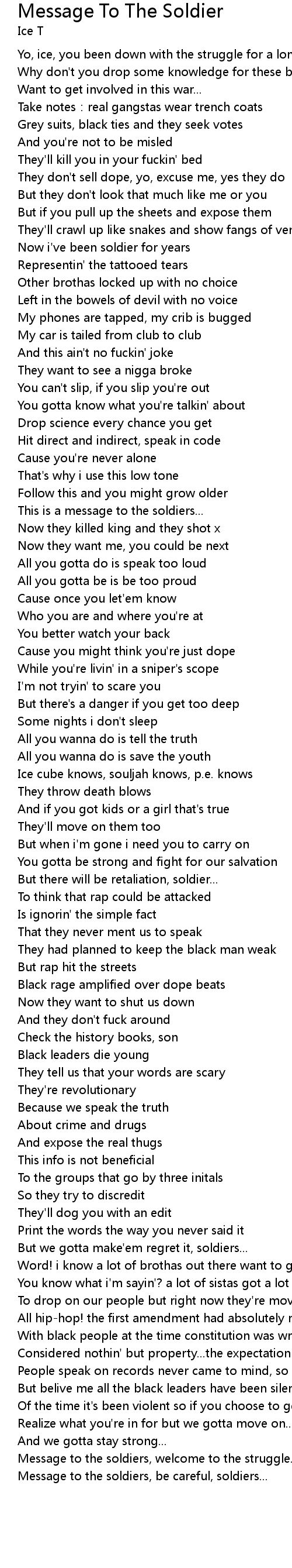 | Yo, ice, you been down with the struggle for a long time, man... | |