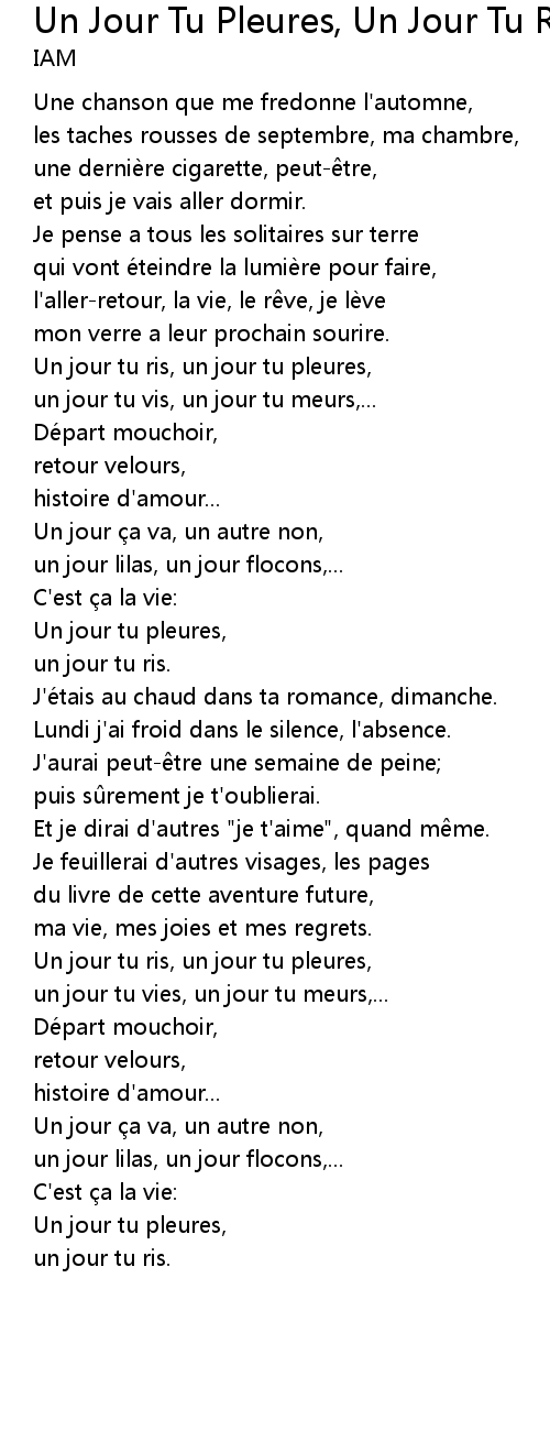 | Un jour tu ris, un jour tu pleures, | |