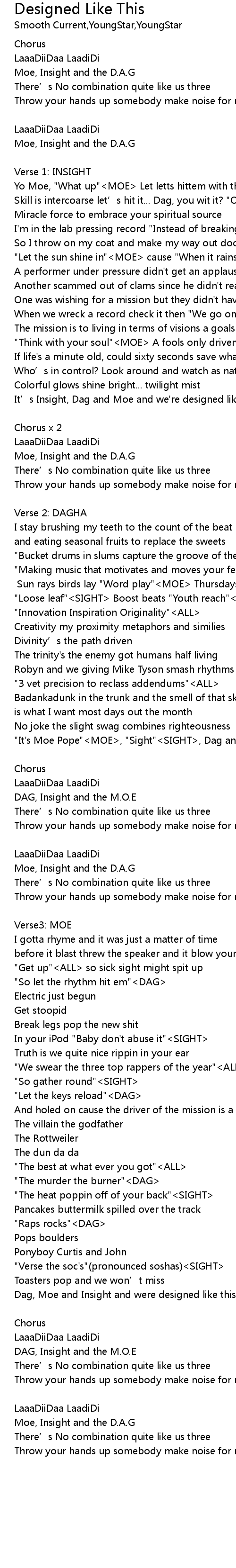 | "It's Moe Pope"<MOE>, "Sight"<SIGHT>, Dag and we're designed like this | |