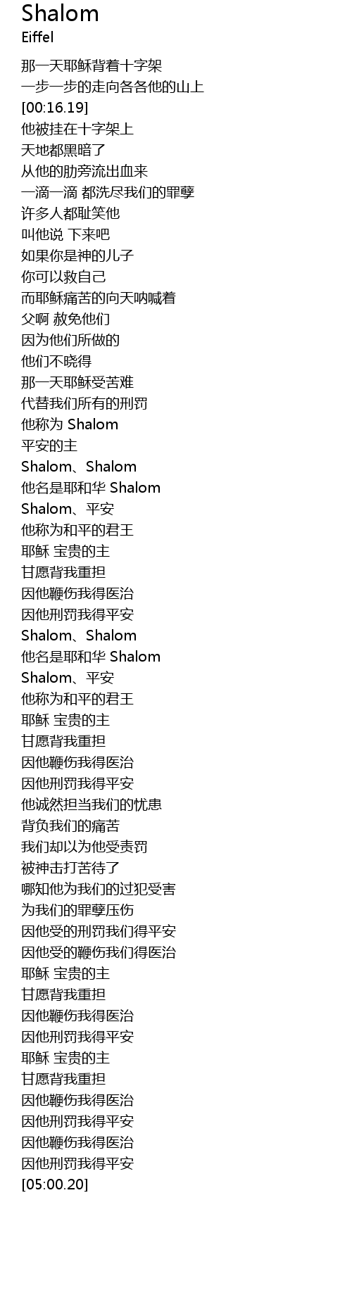 | [02:22.04] | tā míng shì yē hé huá Shalom |