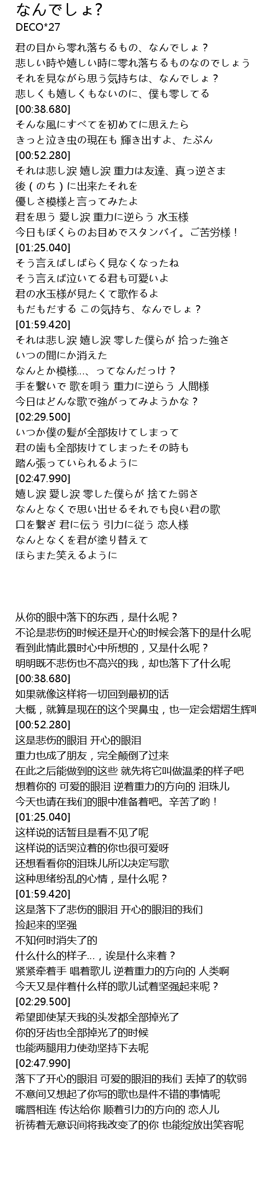 | [00:52.910] | それは悲し涙 嬉し涙 重力は友達、真っ逆さま |