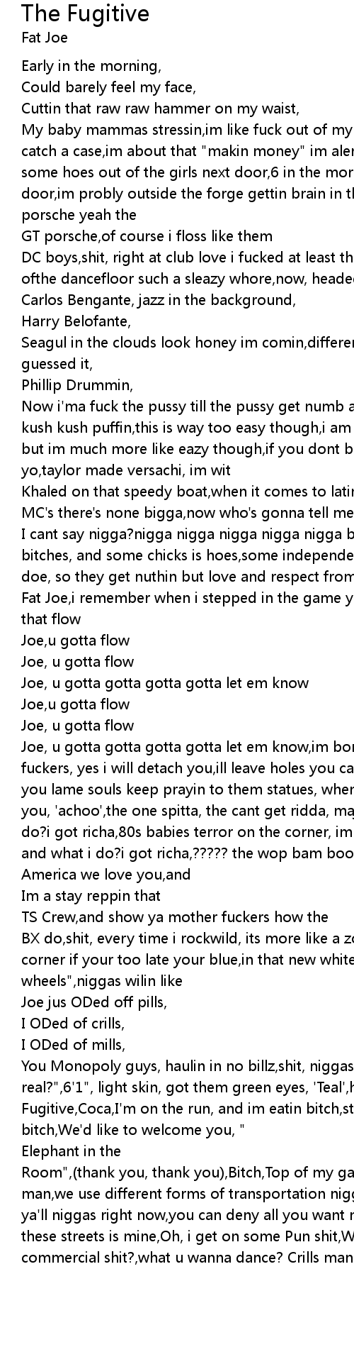 You Monopoly guys, haulin in no billz,shit, niggas keep askin "how come he so real?",6'1", light skin, got them green eyes, 'Teal',haha, It's the Fugitive,Coca,I'm on the run, and im eatin bitch,street runna on this one, bitch,We'd like to welcome you, " |
